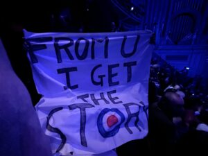 今回はコーラス席というステージの演奏者の後ろ姿しか見えないけれど、観客からは注目されやすい席。「最後にバナーを掲げるからバックステージ・ブログ用の写真撮って!」とキーボード・テックのブライアンにメールを送るも、「悪いね。その日はもういないんだ」