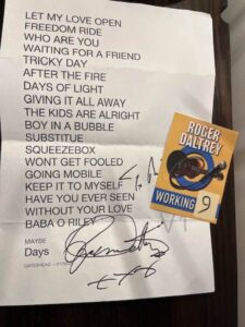 会場の席についてしばらくすると、また秘書さんから電話。急いでステージ脇に駆け寄ると、「ロジャーがこれを渡してくれって」と差し出すのは、4つに折り畳まれた紙。開くと、ゲーツヘッド公演のセットリストに私の名前をいれてサインしてありました。普通のスターなら、面会が終わったら、公演に備えてすぐ頭を切り替え、ファンのことなど抜け落ちてしまうでしょう。それが、別れたあとも数分間、思いを寄せてくれて、その時に出来て相手が喜ぶことをサラッとしてくれる…。これが伝説のスーパースターなのか。家宝です。フレームに入れて大事に飾ります。